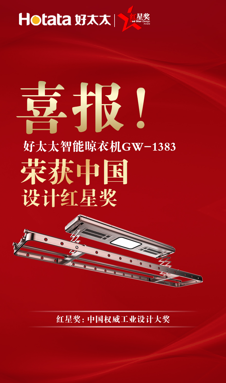 本届参评,好太太智能晾衣机GW-1383凭借卓越品质、创新设计赢得各界评委的一致好评!