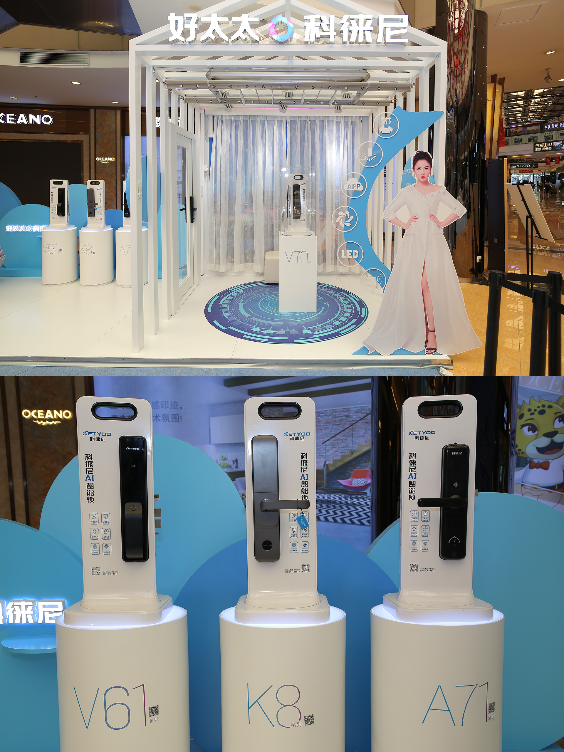 好太太的潮酷智能体验店,蓝白简约配色,极具未来感,智能晾衣机、智能锁、智能交互通通可进行体验,专人进行讲解,科技感满满。