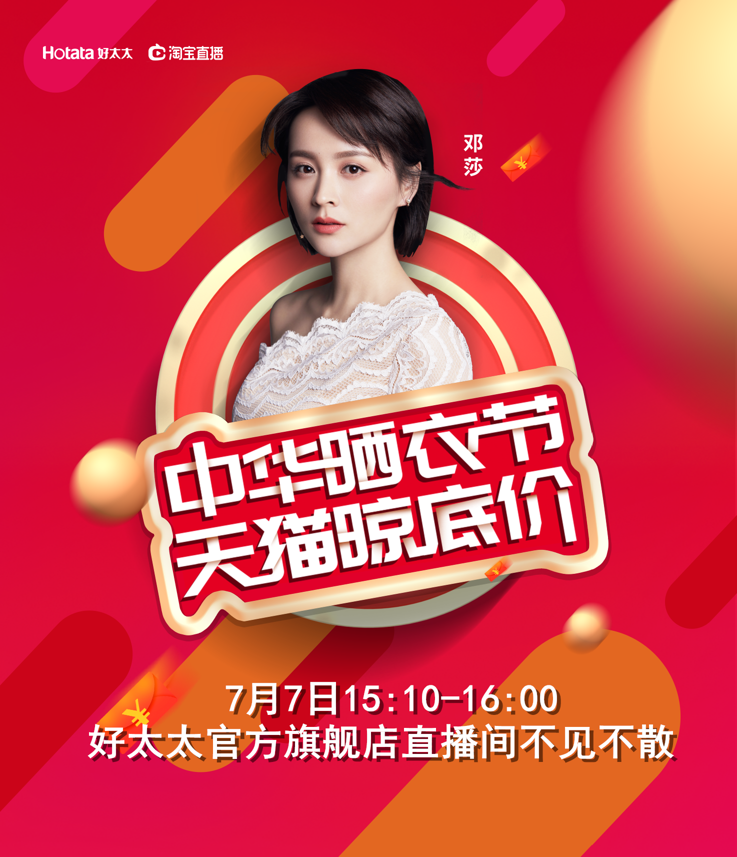 7月7日15:10—16:00,好太太官方旗舰店将邀请“超人妈妈”邓莎亲临直播间,与我们一起面对面互动,分享她的生活态度,亲测好太太与天猫精灵联合定制的新品声控晾衣机,还有3大惊喜福利等你来!