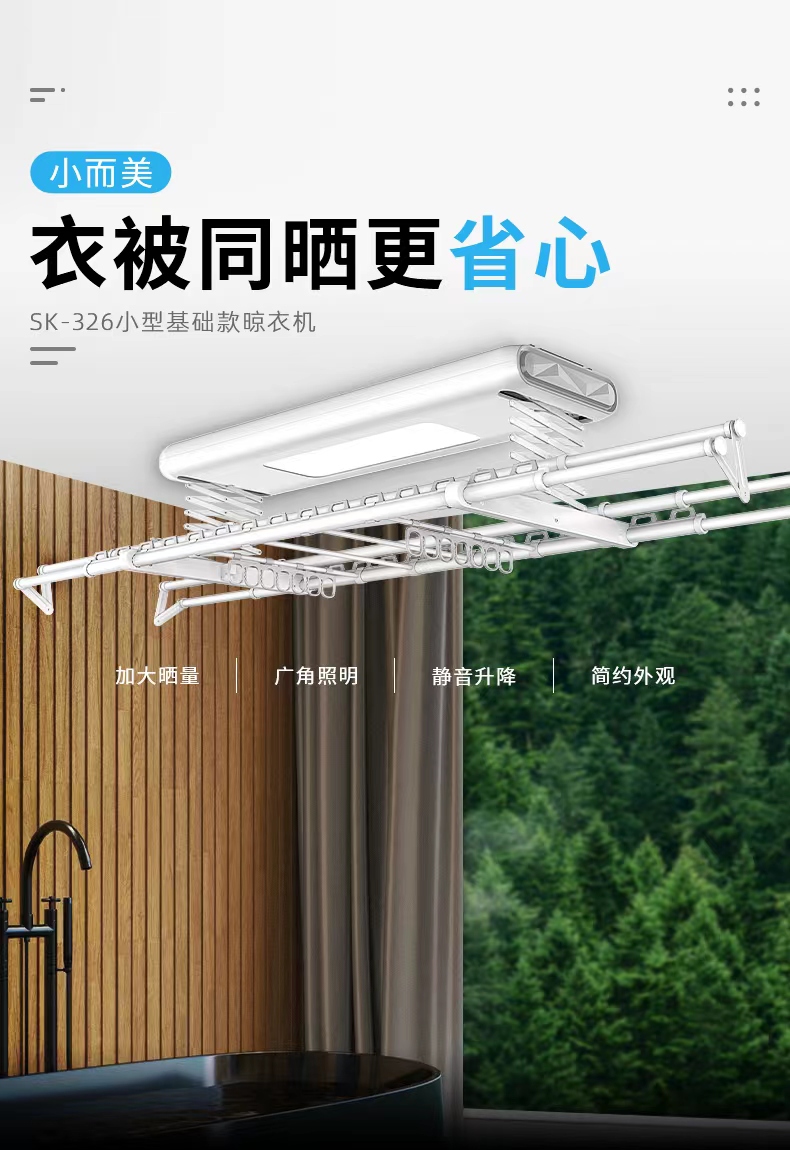 晒客SK-326智能晾衣机:小机身大晒量,外观简约,且具备广角照明,静音升降等功能;晒客SK-327智能晾衣机:集晾衣、烘干、消毒、晾被、风干、照明等功能。