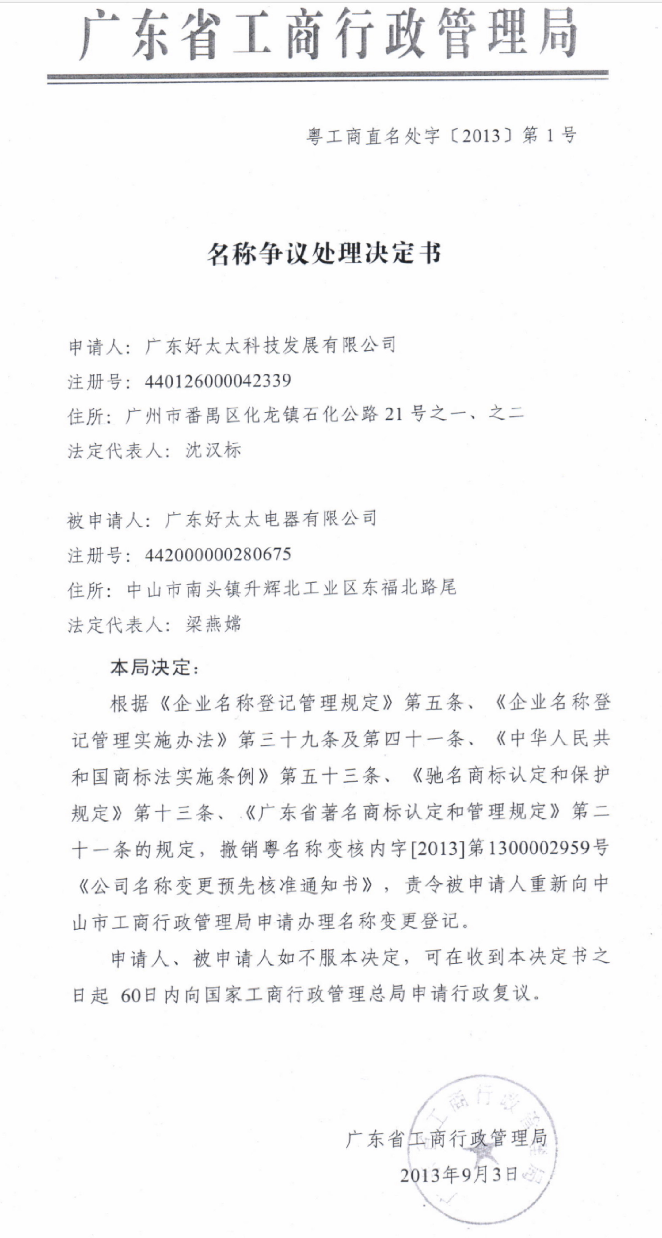 2013年7月24日,老健明通过让其妻子梁燕嫦担任法定代表人,成立好太太电器公司,股东为佛山凯达能公司和好太太电器集团有限公司。凯达能公司以设立新主体的形式继续使用“好太太”字号,并且十数年不间断地在第11 类抽油烟机、燃气灶商品上申请“好太太”、“Haotaitai好太太”商标而被商标局一一驳回。