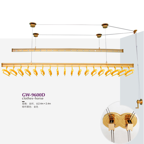 该系列产品标配为手摇系列双杆衣架,杆长2.4米,每根杆孔18个,其中9600A和9600B属同配置不同色,可根据顾客需求选择配新款最豪华宽肩铝合金衣架15或18个。9600C和9600D属同配置不同色,配新款豪华宽肩防风塑料衣架18个,充分照顾到顾客对衣架的不同习惯和需求。